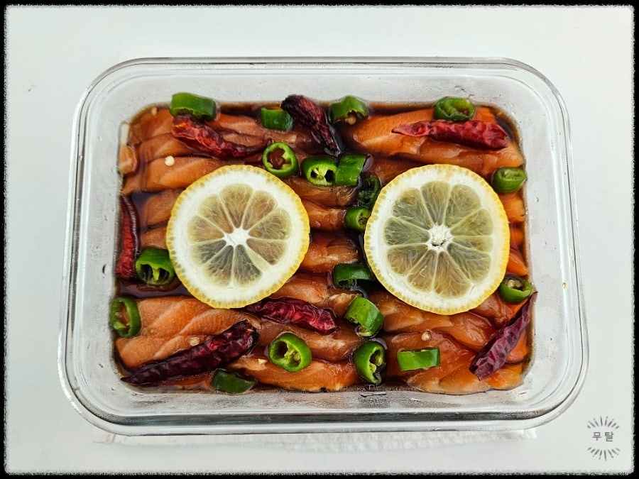 밀폐 용기에 연어, 청양고추, 베트남 고추, 양파, 레몬 넣기