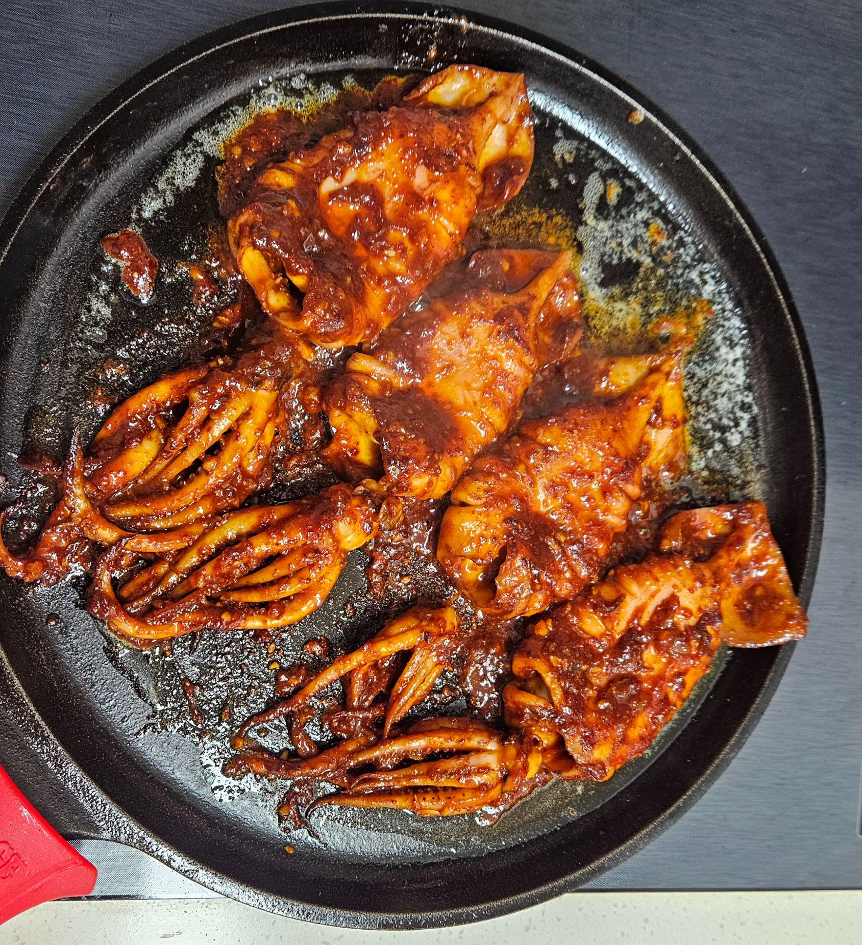 양념을 바른 오징어를 팬에 다시 올려 앞뒤로 구워줍니다.